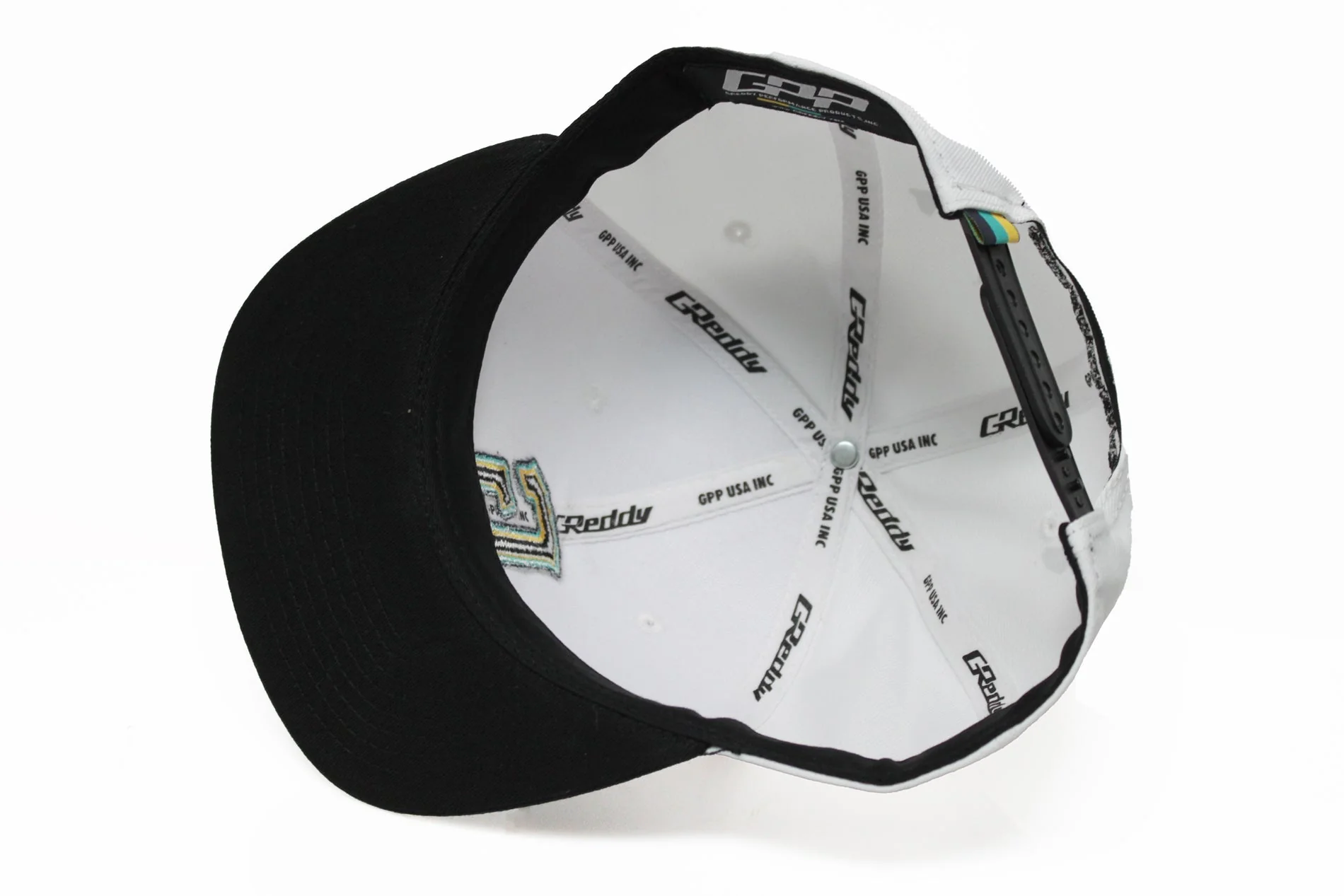 Color: White and Black Cap - Black, Blue, Teal, Yellow G stitching Front / Black GPP stitching Back